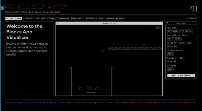 Concept web site for presets data of 500 apps on the app market. Using special visualization, each app is represented with a square varying in size and color in order to show data such as installation count and revenue. the user can enjoyfully interact with the squares to learn about the apps.